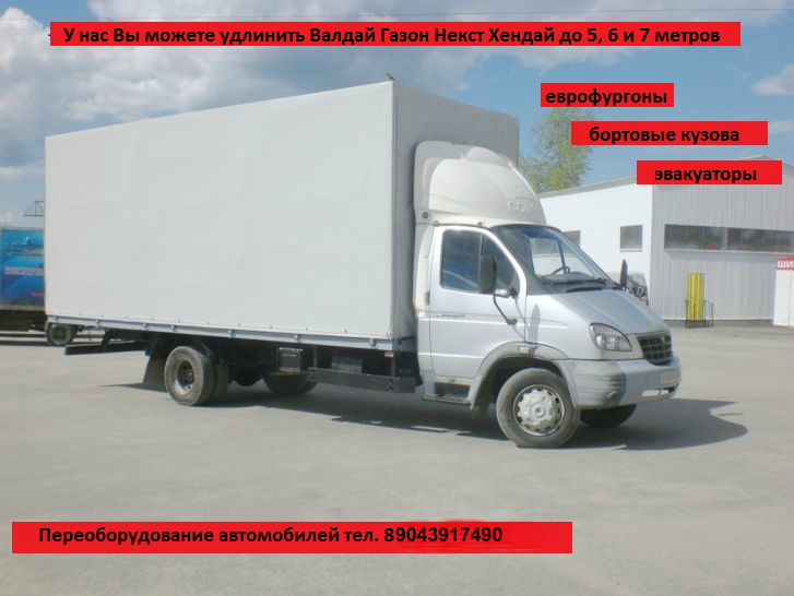 Есть желание удлинить или переоборудовать газель фермер, Газон Next(Некст), Газон, газель Next(Некст), газель бизнес, Валдай? Производим переоборудование и удлинение любой сложности: удлинение рамы, переоборудование в эвакуатор, изготовление бортовых кузовов, производство и установка промтоварных,изотермических фургонов, переобордование в тент с воротами. Помогаем оформить документы. Возможно удлинить (шасси)раму газели от 3,1 м до 6,2м, удлинить валдай от 3.6 м до 7.5м, удлинить газон от 3,6 м до 7.5 м. Переоборудовать газель в любой кузов. переоборудовать Газон в эвакуатор.