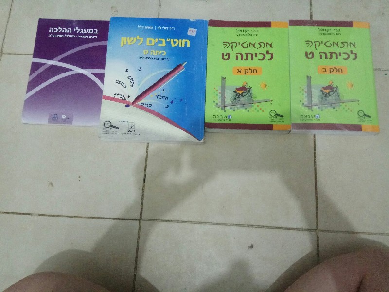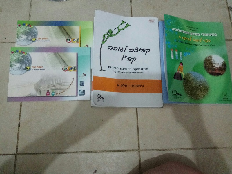 и детская книга ( обучения ивриту, обучение писать, читать, считать, различать время, карта израиля,и т.д. ) все в одной книги. ее продаю за 120 шекелей, так как онаочень хорошая да и бралась по высокой цене. еще есть книга о политике ( эзрахут ) тоже для школы за 9-й класс.
