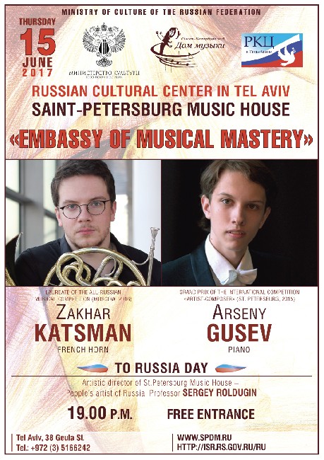 15 июня, в четверг, в Израиле ко Дню России состоится концерт проекта «Посольства мастерства». Санкт-Петербургский Дом музыки приглашает в Российский культурный центр в Тель-Авиве, где свое мастерство продемонстрируют молодые петербуржцы, лауреаты международных конкурсов Захар Кацман (валторна) и Арсений Гусев (фортепиано).
