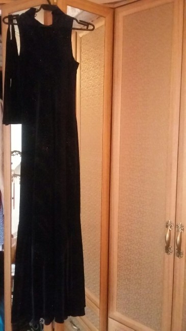Платье черное вечернее , бархатно-велюровое , отделано стразами с перчатками на одном пальце .в идеальном состоянии размер 46 . (Цена -3000 р).