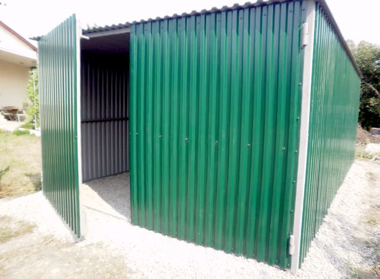 Каркас из профиля 60*30. Прожилины из профиля 40*20. Вход – ворота распашные 3м*1,8м. облицовочная обшивка - профлист оцинкованный/цветной.