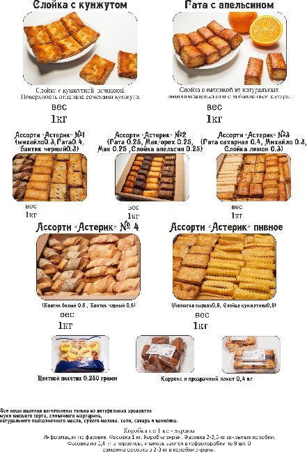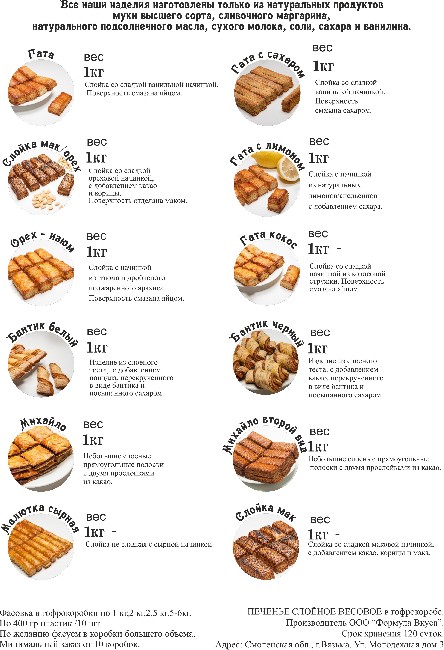 Ассортимент на сегодняшний день: гата, гата с сахаром, бантик черный, бантик белый, слойка с лимоном/апельсином, слойка с кунжутом, малютка сырная, слойка с маком, слойка мак/орех, слойка орех/изюм, слойка кокос, слойка Михайло.