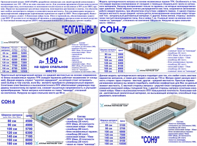Вы можете полежать на образцах готовых матрасов у нас на выставке и точнее определиться с моделью. Адреса выставок: 1) пр-т Созидателей 1Б, "ОЛИМП-2" (Пн-Сб: с 8:00-18:00). 2) ул. Тимуровская 1 (Пн-Вс: с 11:00 - 20:00). В Сб и Вс - желательно предварительно звонить.
