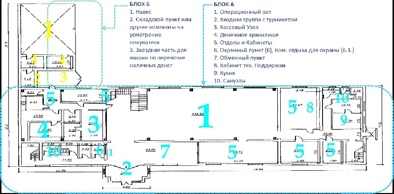 Во дворе имеются специализированное помещение для заезда и стоянки автомашины по перевозке наличных денег, а также навес с оборудованием по автономному электрическому питанию для всего здания.