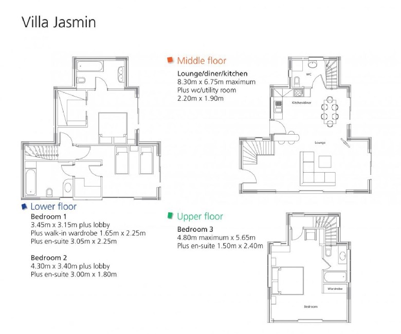 Tрехкомнатная, полностью кондиционируется, включает 6 спальных мест и размещена на трех этажах.Центральный этаж включает в себя гостиную/обеденную/ область просмотра ТВ, кухню с баром для завтраков и подсобку/туалет. С этого этажа есть выход на стоянку, бассейн, террасу и балконы.