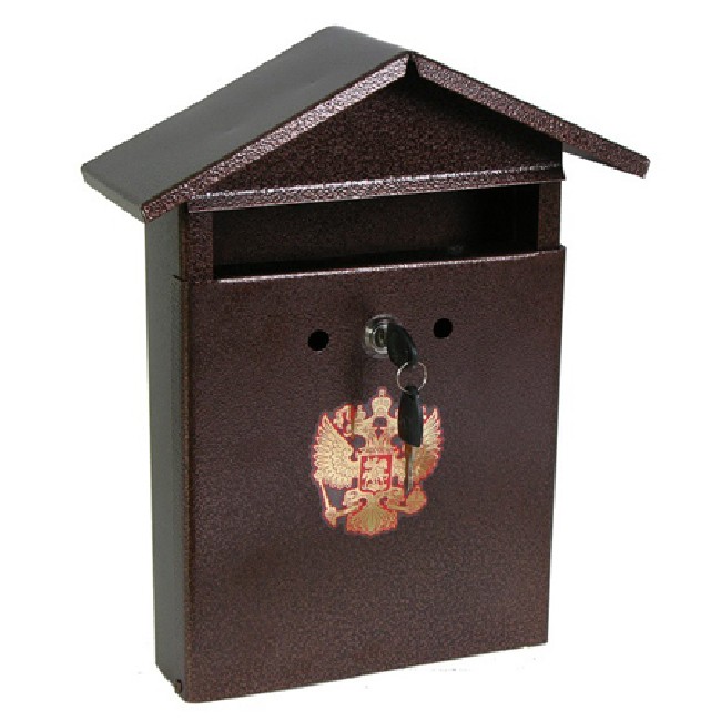 Почтовый ящик изготовлен в форме Домика. Благодаря такой форме осадки не попадают во внутрь и вся корреспонденция остается в целости. На дверце ящика предусмотрены отверстия , с помощью них можно отслеживать наличие почты в ящике. В комплекте замок и два ключика.