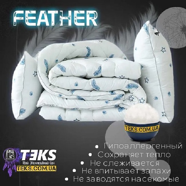 Набор FEATHER одеяло и две подушки – теплый, легкий и дышащий комплект, в состав которого входит лебяжий пух (гипоаллергенное искусственное волокно). Используемые при производстве материалы обеспечивают оптимальные для спящего человека условия. Позволяют поддерживать максимально комфортную температуру. За счет воздухопроницаемости чехла из микрофибры и наполнителя обеспечивают необходимую вентиляцию воздуха. Качество микрофибры, из которой изготовлен верх одеяла, гарантирует изделию прочность и износостойкость.