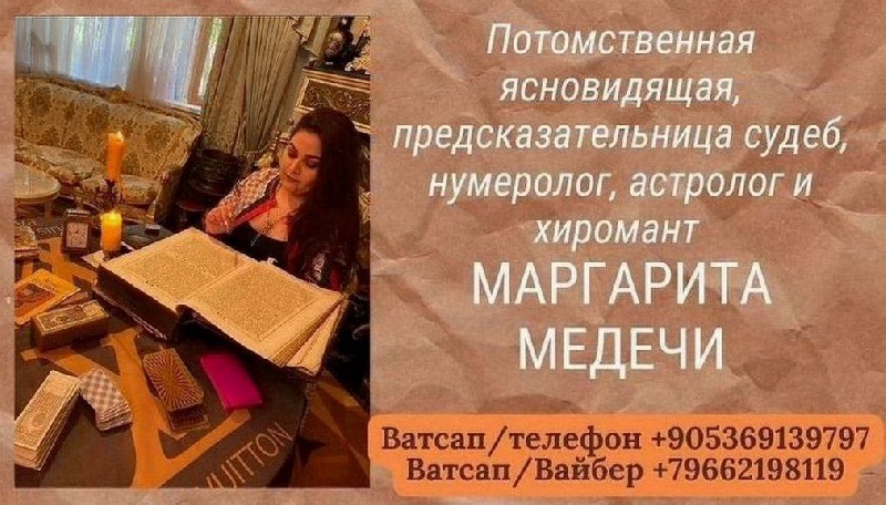 предсказательница судеб, сертифицированный нумеролог, астролог и хиромант Маргарита Медечи поможет всем нуждающимся найти причину того, от чего возникла их проблема. После чего обязательно покажет выход из сложившейся ситуации и устранит все опасные угрозы.