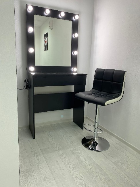 Для вас есть Гримерное зеркало с ящиком, разделённым на 2 секции, комод, кольцевая лампа, чайник и фотозона
