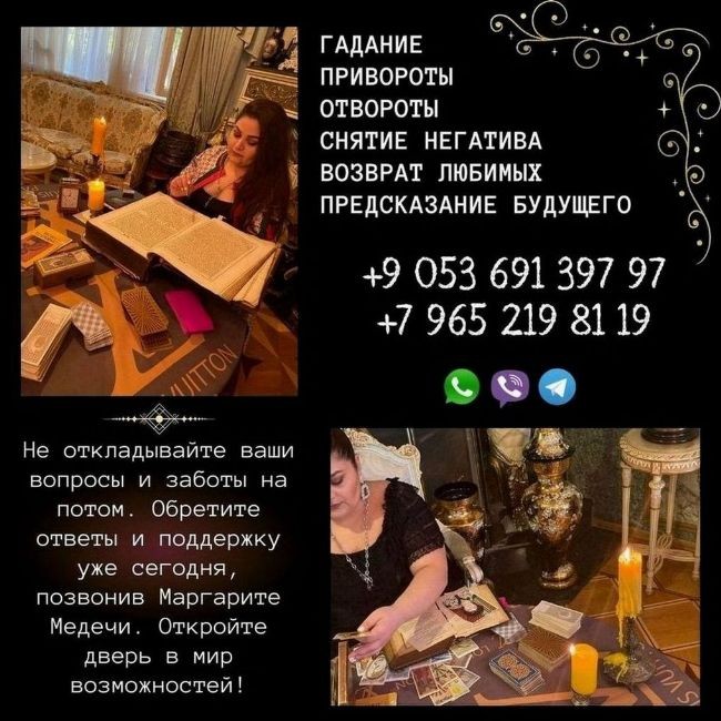 Не откладывайте ваши вопросы и заботы на потом. Обретите ответы и поддержку уже сегодня, позвонив Маргарите Медечи. Откройте дверь в мир возможностей!