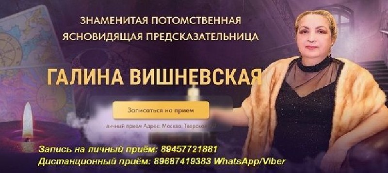 Галина Вишневская – потомственная ясновидящая, целительница и предсказательница, наследница мудрости и знаний древнего княжеского рода венгерских цыган Дошкещи. Галина не просто предлагает помощь, она становится вашим проводником в мир гармонии, удачи и любви.