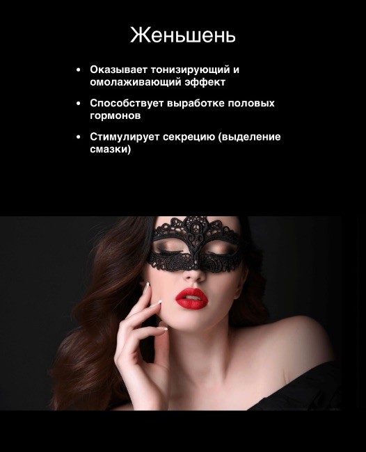 Помогает раскрыть все грани вашей сексуальности: Усиливает выработку гормонов, необходимых для возбуждения, расслабляет, возбуждает, повышает сексуальное желание, улучшает настроение, позволяет получить от секса истинное удовольствие.