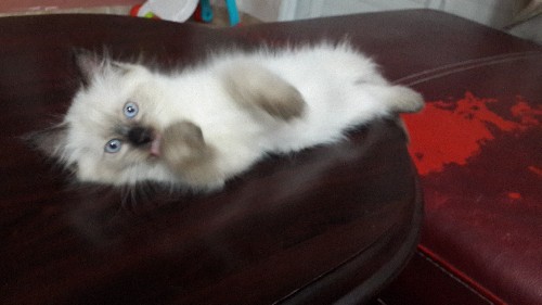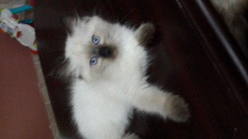 Очаровательный голубоглазый котенок породы регдолл(тряпичная кукла). Мальчик- ласковый, приучен к лотку, сухому корму, когтеточке.Кошки этой породы привязаны к человеку, контачат с детьми, очень умные. Недорого.