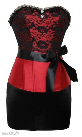 Моделирующий корсет черно-красного цвета. Создает неотразимое декольте. Украшен рюшами, кружевом и лентами. Сбоку на молнии, сзади - на шнуровке. Юбка в комплекте. Материал: полиэстер+спандекс. Длина: 32 см.