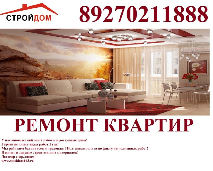 Мы предлагаем услуги по высококачественному ремонту квартир за доступные деньги! У нас многолетний опыт работы, осуществляем как бюджетные ремонты, так и ремонты с дизайн-проектами!
